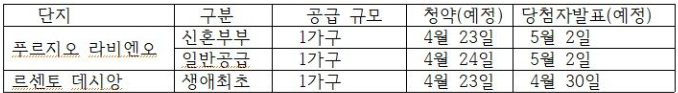 ‘과천 푸르지오 라비엔오’: 신혼부부 특별공급과 일반공급으로 각각 한 가구씩 제공됩니다.