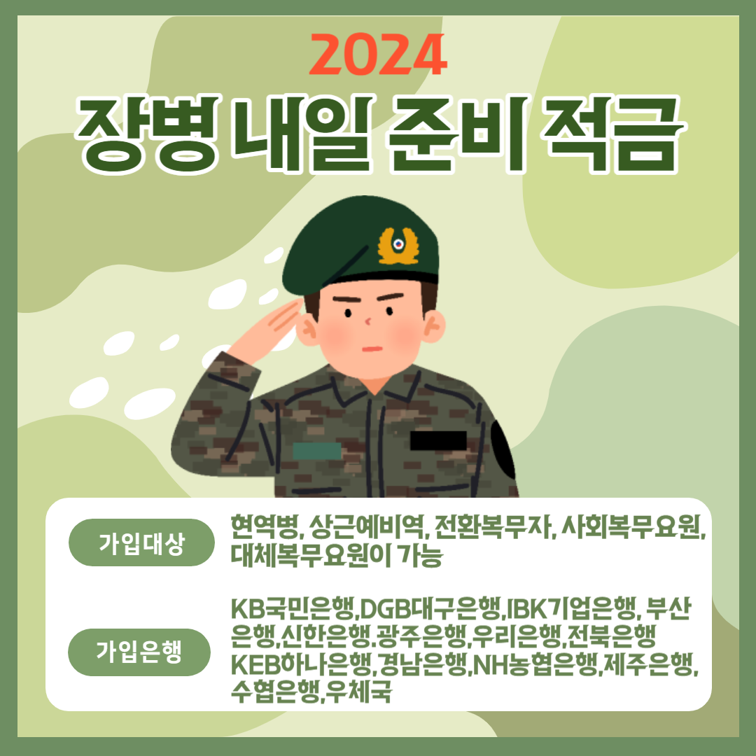 정식 명칭은 장병 내일 준비 적금으로 군인들이 복무 기간 동안 저축을 할 수 있는 금융 상품입니다. 일반적으로 14개 은행에서 제공되며(KB국민은행,DGB대구은행,IBK기업은행, 부산은행,신한은행.광주은행,우리은행,전북은행,KEB하나은행,경남은행,NH농협은행,제주은행,수협은행,우체국), 군인들은 복무 기간 동안 일정한 금액을 매월 저축합니다.