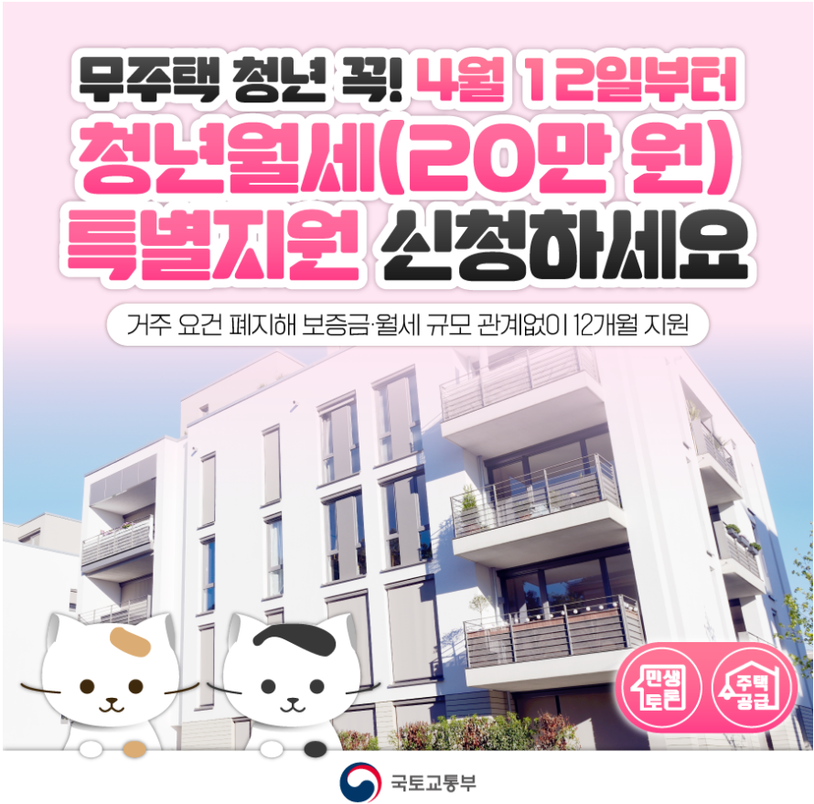 국토교통부는 더 많은 청년의 주거 부담을 완화하기 위해 ‘청년월세 특별지원’ 사업의 거주 요건을 폐지하고, 이를 반영해 4월 12일(금)부터 신규 대상자 신청을 받는다고 합니다.