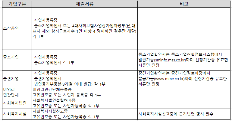 기업구분별 제출서류가 다릅니다.